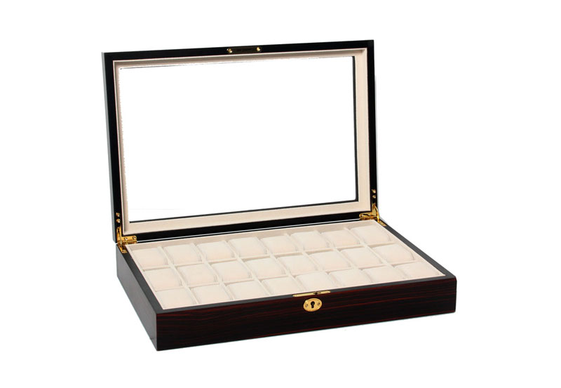 Exclusieve houten horlogekist geschikt voor het opbergen van 24 horloges. Gemaakt van gecertificeerd MDF hout met zacht velours materiaal aan de binnenkant. Het deksel is voorzien van mineraal glas en een duurzaam slot met extra sleuteltje. Bekijk al onze horlogekisten in de shop!