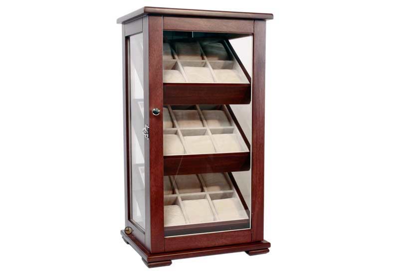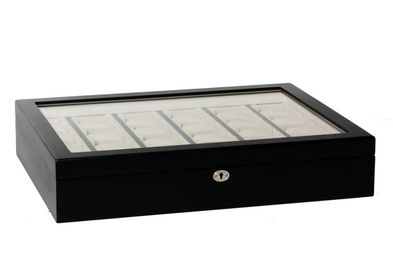 Deze horlogevitrine is tot in de puntjes afgewerkt. De horlogevitrine is op 3 verschillende manieren te presenteren: staand, liggend of hangend aan de muur. Er is maar liefst plaats voor 30 (XXL) horloges. Voorzien van mineraal glas en een duurzaam slot met extra sleuteltje. Deze horlogevitrine kunt u op drie verschillende manieren presenteren; staand, liggend of aan de muur (zie foto's). Dat maakt deze extra large horloge vitrinekast uniek en onderscheidend!