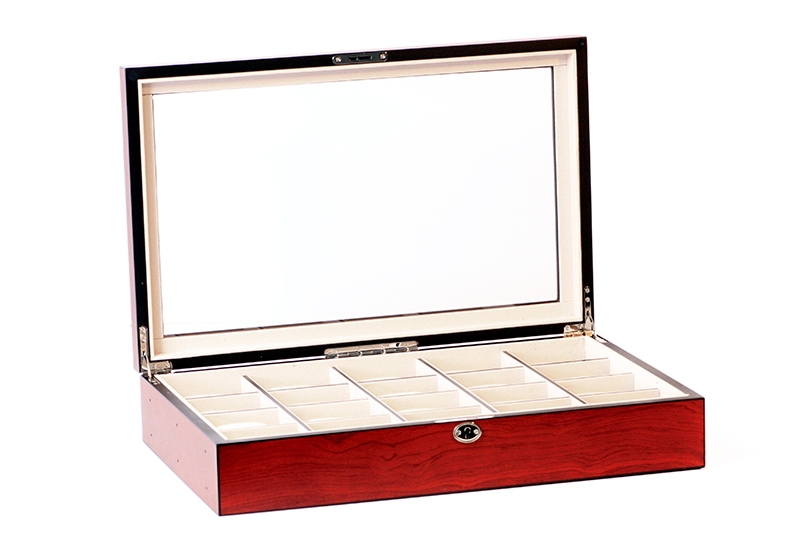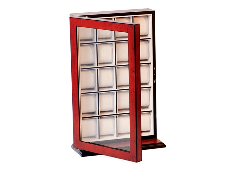 Deze gave horlogevitrine ziet er niet alleen te gek uit, maar berg je jouw horloges ook veilig op. Deze horlogevitrine is gemaakt van hout en biedt plaats aan 20 horloges. Deze vitrine is afgewerkt in een prachtige bubinga kleur.