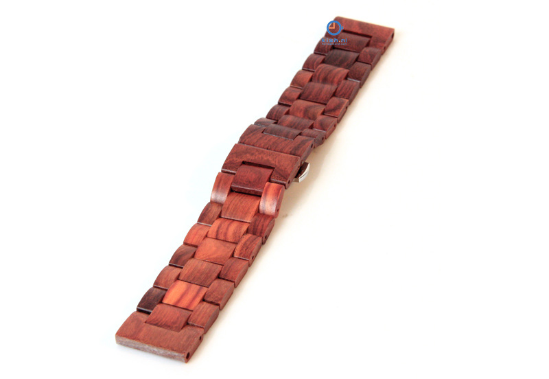 Exclusieve horlogeband gemaakt van echt hout. Deze 22mm horlogeband is uniek, omdat niet ?n stukje hout hetzelfde is. De geschakelde horlogeband is gemaakt uit Indian Rosewood. Een sterk hout dat ook gebruikt wordt voor biljartkeus en schaakstenen. De 22mm houten horlogeband heeft een vlindersluiting met drukknoppen gemaakt van roestvrij staal.