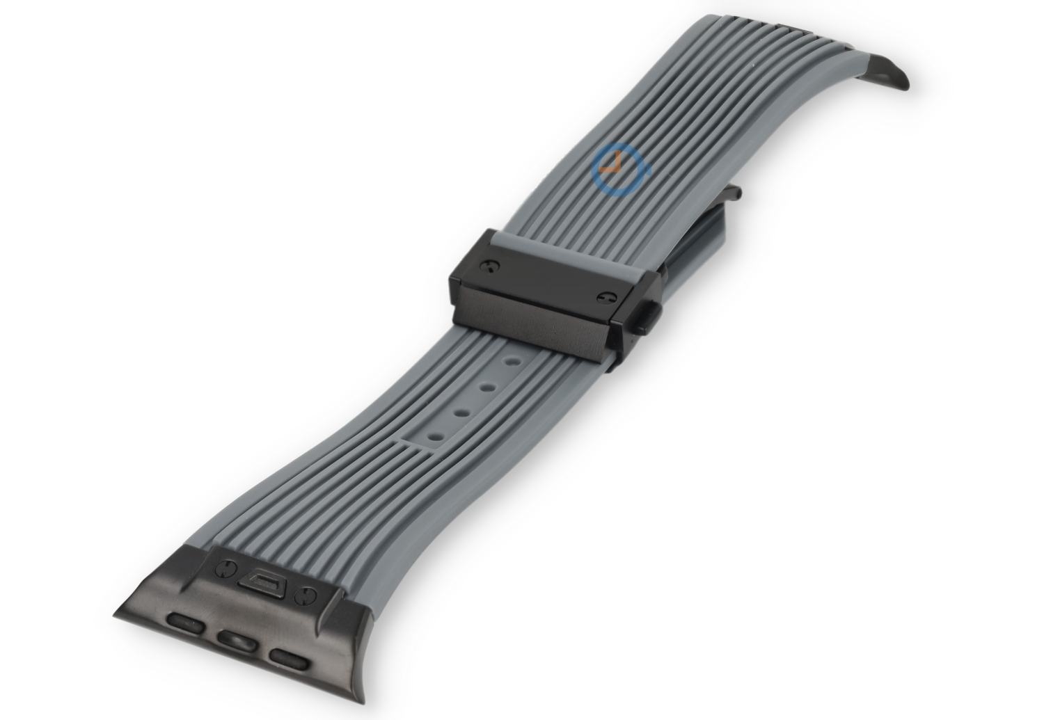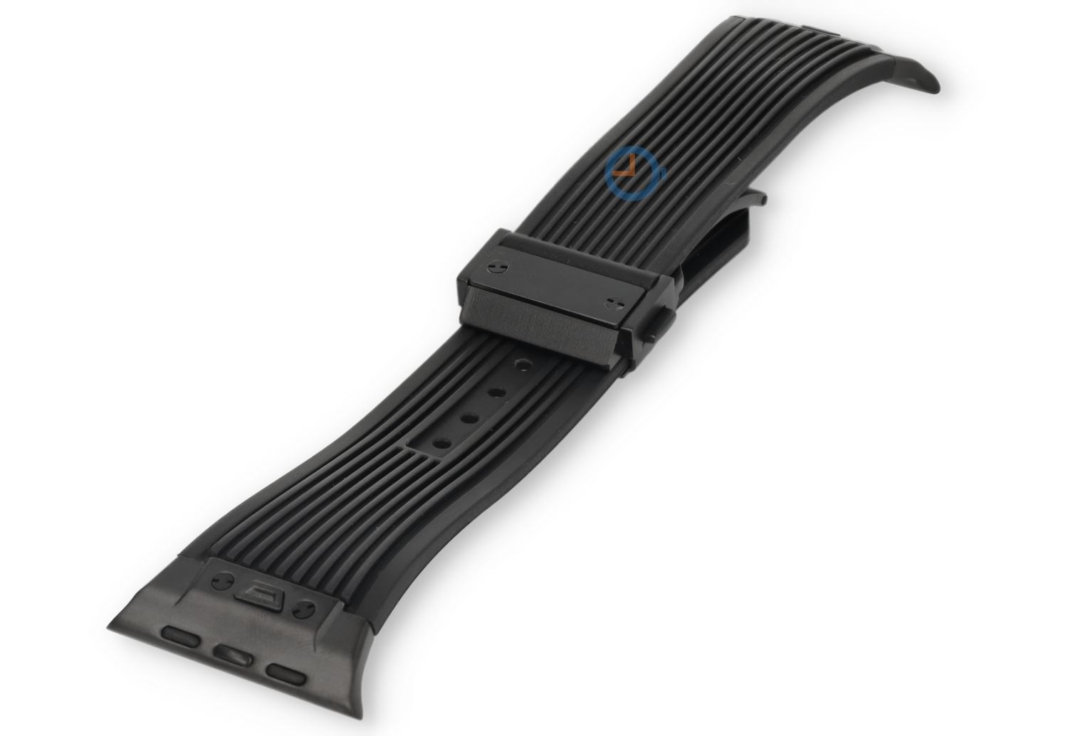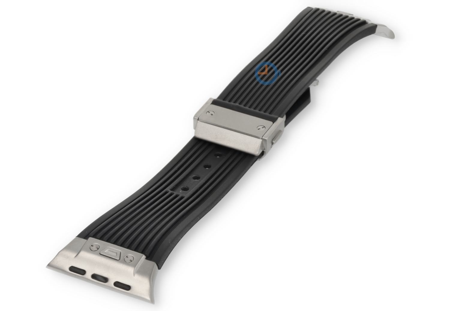 Hublot staat bekend het gebruik van geschroefde details in de horlogeband. De zilverkleurige adapter van dit Apple watch bandje loopt direct over in het design van Hublot en heeft een mooie doorloop naar het rubber. Een betere afwerking krijg je niet!