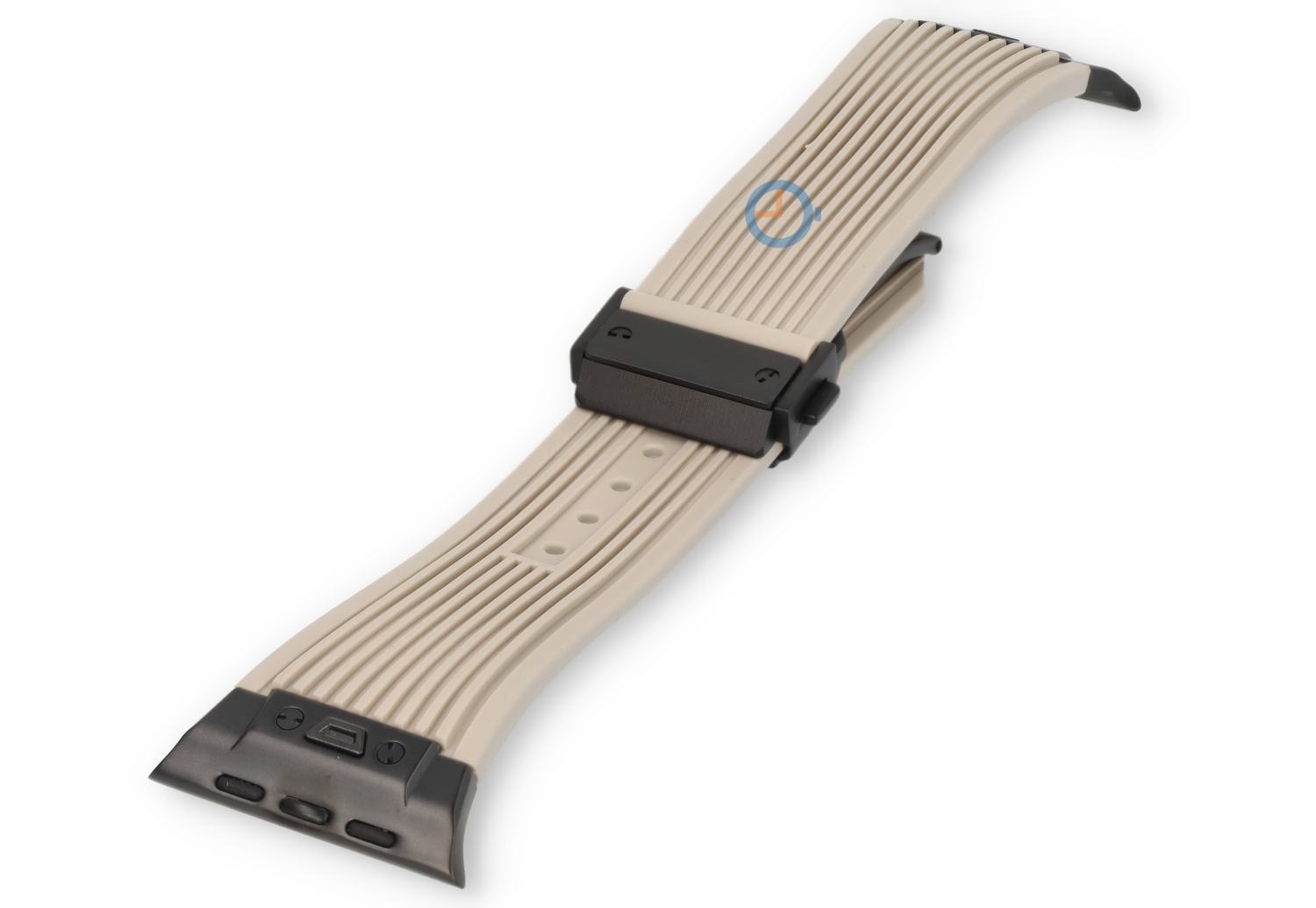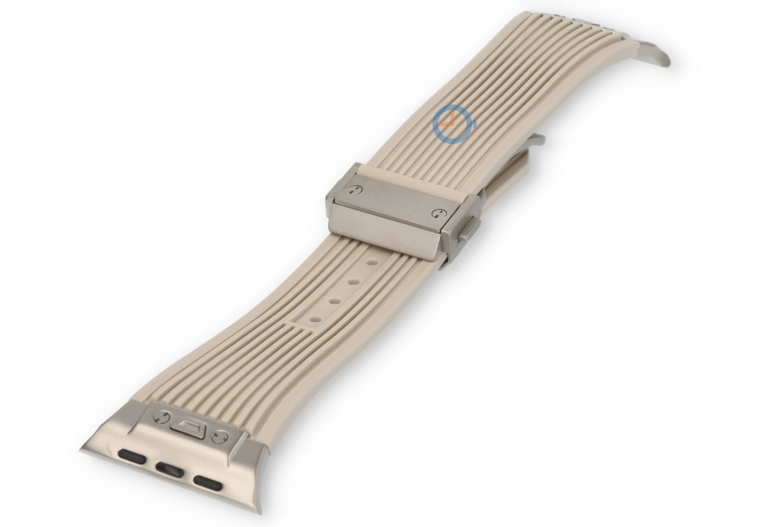 Deze Apple watch horlogeband is gemaakt van stevig, soepel siliconen en heeft een robuuste zilverkleurige vouwsluiting met drukkers. De bekende schroef-details vind je ook terug in de sluiting. Je kan het horlogebandje verstellen van 140mm naar 190mm (gemeten zonder Apple watch). Zo kun je altijd de juiste maat dragen. Dit Apple bandje heeft een formele uitstraling en is daarom zowel zakelijk als privé een goede match.