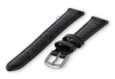 Kleine horlogeband van leer - 14mm - zwart. Een effen gekleurd bandje met luxe croco-print voor d? klassieke look. Maak je horloge weer compleet met deze betaalbare horlogeband. Deze horlogeband van echt leer is 14mm breed en loopt terug naar 12mm. Je ontvangt dit leren bandje inclusief de roestvrijstalen gespsluiting in zilverkleur.