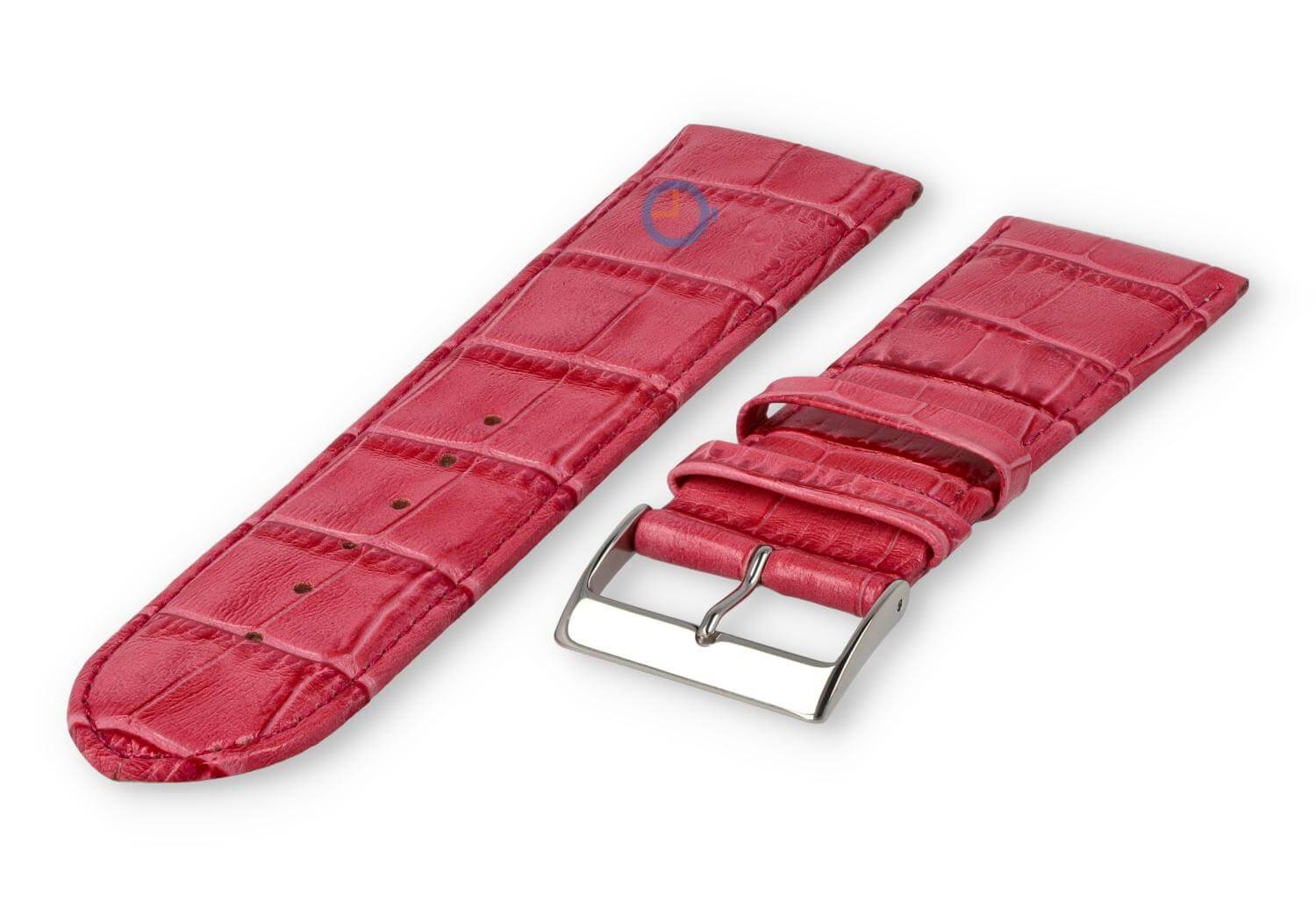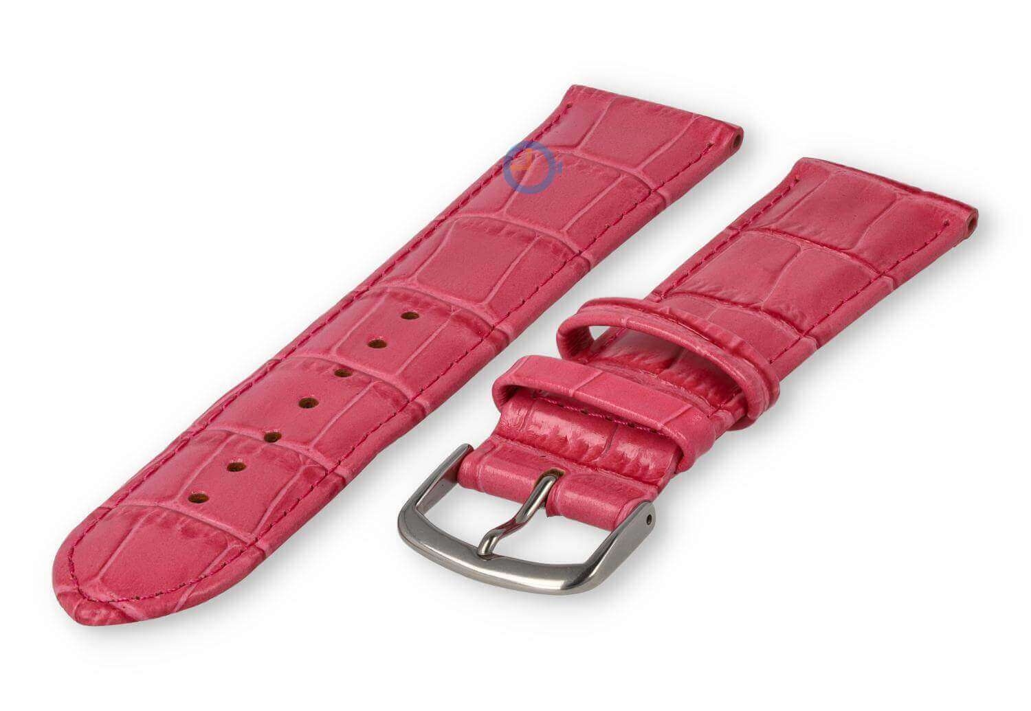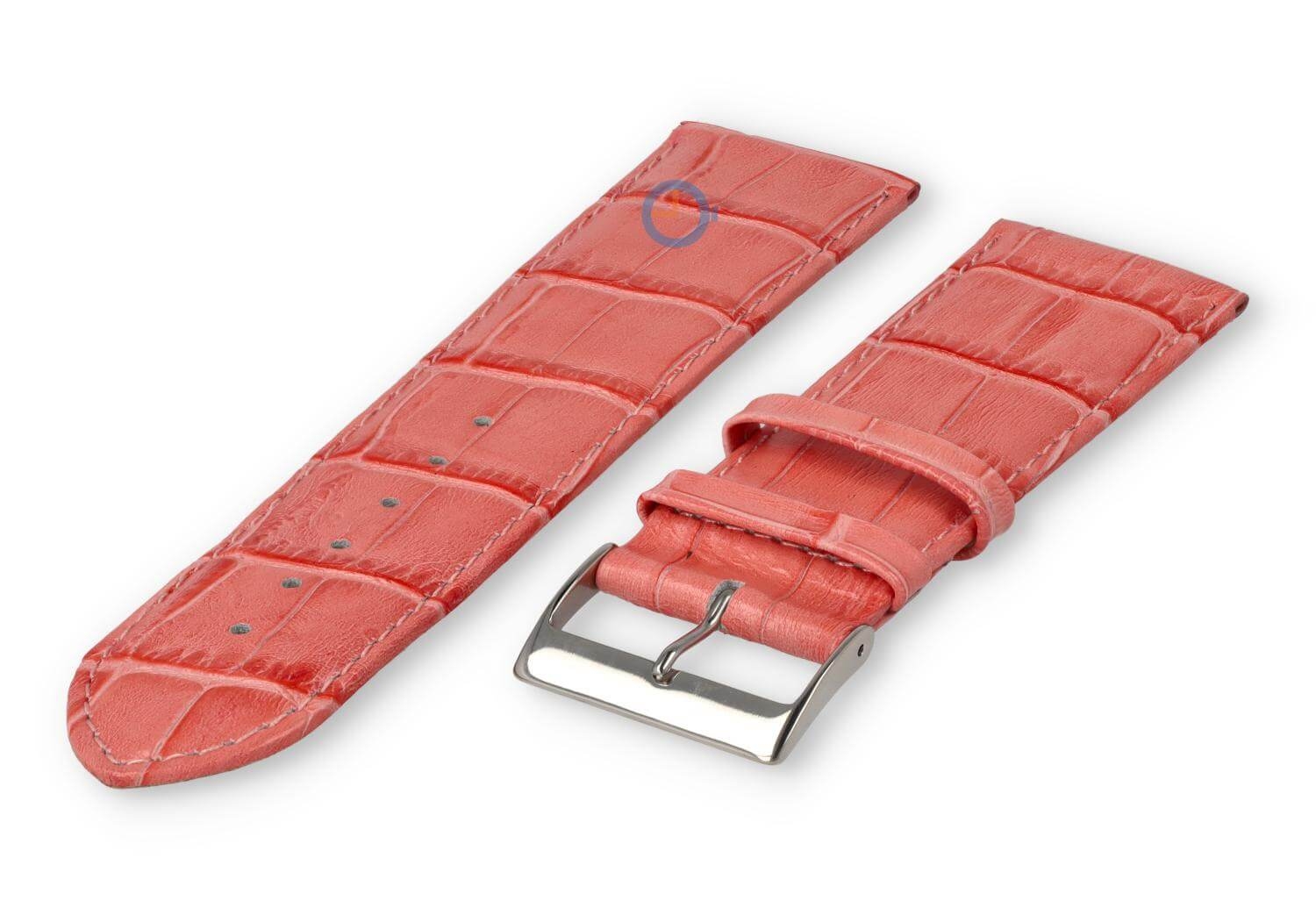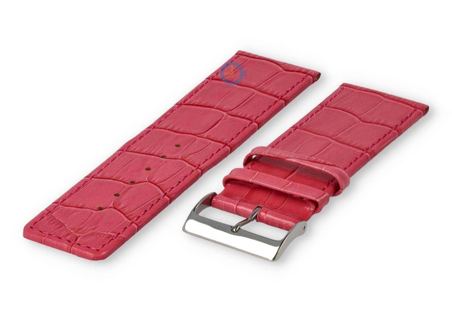 Luxe croco horlogeband - 30mm - roze. Extra brede horlogeband voor grotere horloges. Een verfijnde, licht opgevulde horlogeband die jouw horloge weer als nieuw maakt. Deze horlogeband van echt leer is 30mm breed en loopt terug naar 28mm. Je ontvangt dit leren bandje inclusief de roestvrijstalen gespsluiting in zilverkleur.