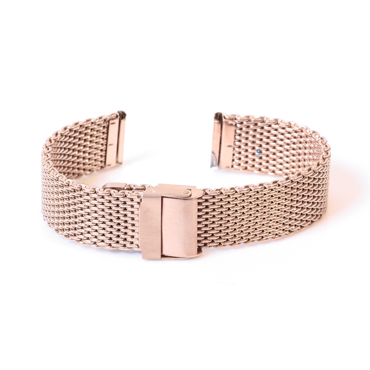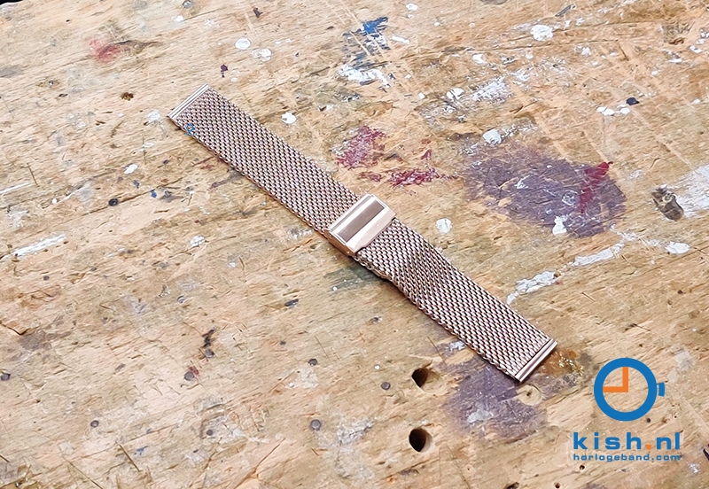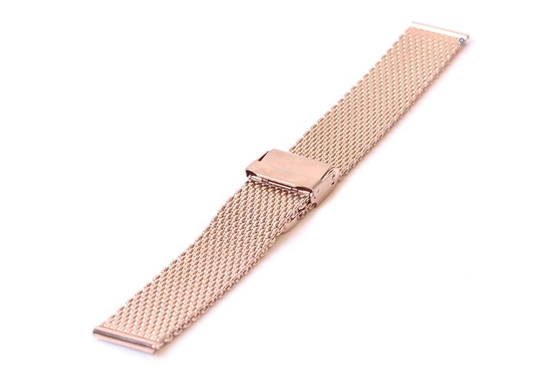 Universele horlogeband 18mm Rosegoud. Deze stalen horlogeband geeft jouw horloge een stoere, maar toch classy look. Het gevlochten staal is niet alleen super sterk, maar ook veel flexibeler dan een schakelhorlogeband. De robuuste horlogeband heeft een verstelbare sluiting met een extra veiligheid systeem. De sluiting kan je eenvoudig zelf verstellen, zo is het horlogebandje passend voor bijna elke polsmaat.