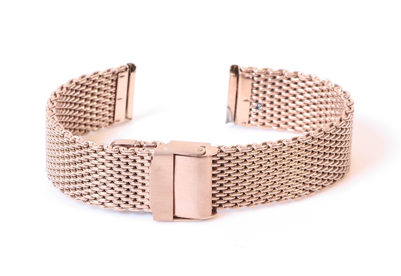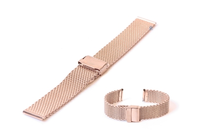Universele horlogeband 20mm Rosegoud. Deze stalen horlogeband geeft jouw horloge een stoere, maar toch classy look. Het gevlochten staal is niet alleen super sterk, maar ook veel flexibeler dan een schakelhorlogeband. De robuuste horlogeband heeft een verstelbare sluiting met een extra veiligheid systeem. De sluiting kan je eenvoudig zelf verstellen, zo is het horlogebandje passend voor bijna elke polsmaat.