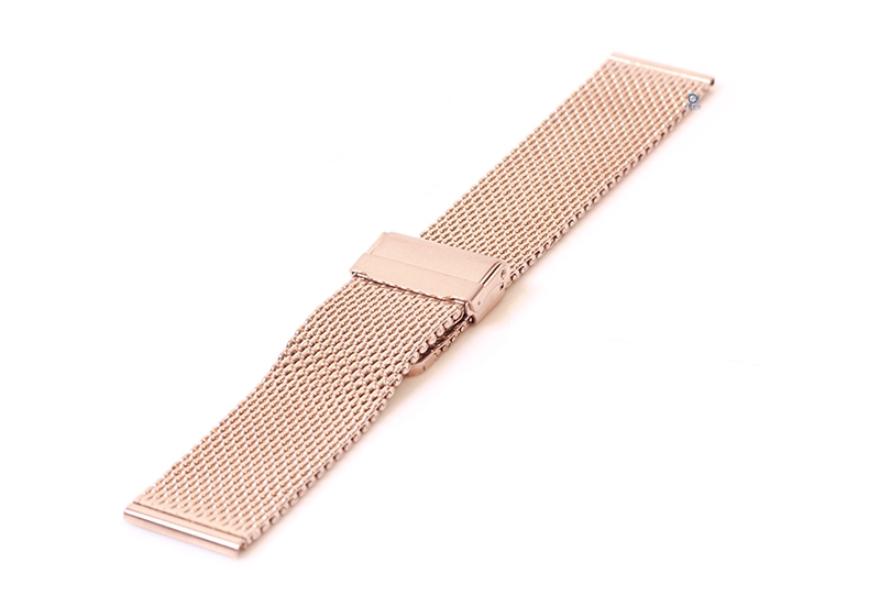 Universele horlogeband 24mm Rosegoud. Deze stalen horlogeband geeft jouw horloge een stoere, maar toch classy look. Het gevlochten staal is niet alleen super sterk, maar ook veel flexibeler dan een schakelhorlogeband. De robuuste horlogeband heeft een verstelbare sluiting met een extra veiligheid systeem. De sluiting kan je eenvoudig zelf verstellen, zo is het horlogebandje passend voor bijna elke polsmaat.
