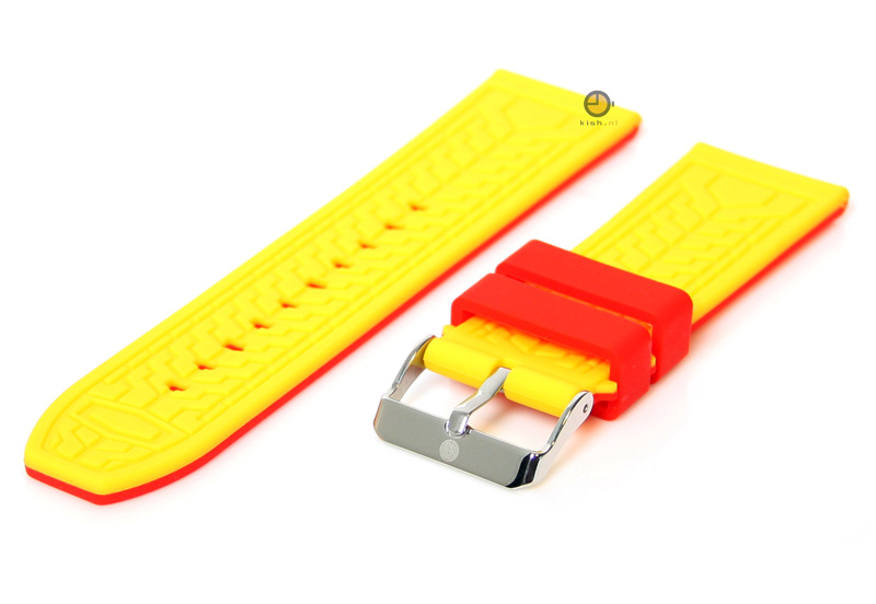 Omkeerbare horlogeband 26mm siliconen. Deze felgekleurde horlogeband is aan beide kanten te dragen. De ferrari rode horlogeband heeft 2 gele lijnen. De binnenkant is geel en heeft een soort bandenmotief. De horlogeband is gemaakt van flexibel siliconen en heeft een prettig draagcomfort. Deze 26mm siliconen horlogeband wordt geleverd inclusief gesp. Bestel de springbar removal tool en 26mm springbars gelijk mee en wissel gemakkelijk tussen uw horlogebanden.