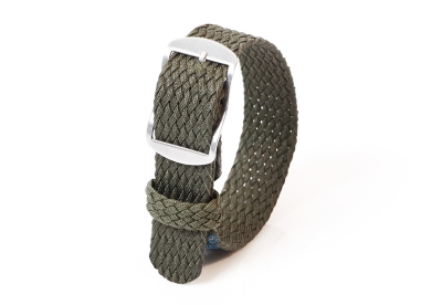 Perlon is een ijzersterk kunststofvezel die verwant is aan nylon. Dit materiaal wordt o.a. verwerkt in parachutes en touw voor de luchtmacht en marine. Het gevlochten horlogebandje kan goed tegen een stootje en is waterbestendig. De randen van het horlogebandje zijn gesealed met een laser, waardoor het horlogebandje geen rafelige randen heeft.
