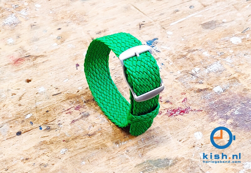 Perlon is een ijzersterk kunststofvezel die verwant is aan nylon. Dit materiaal wordt o.a. verwerkt in parachutes en touw voor de luchtmacht en marine. Het gevlochten horlogebandje kan goed tegen een stootje en is waterbestendig. De randen van het horlogebandje zijn gesealed met een laser, waardoor het horlogebandje geen rafelige randen heeft.