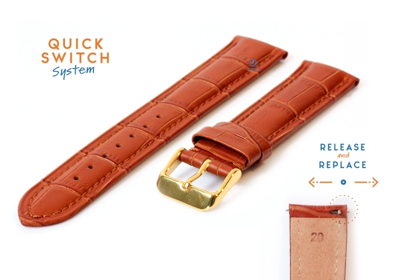 Klassieke horlogeband met gouden gesp - 18mm cognacbruin leer met croco print.