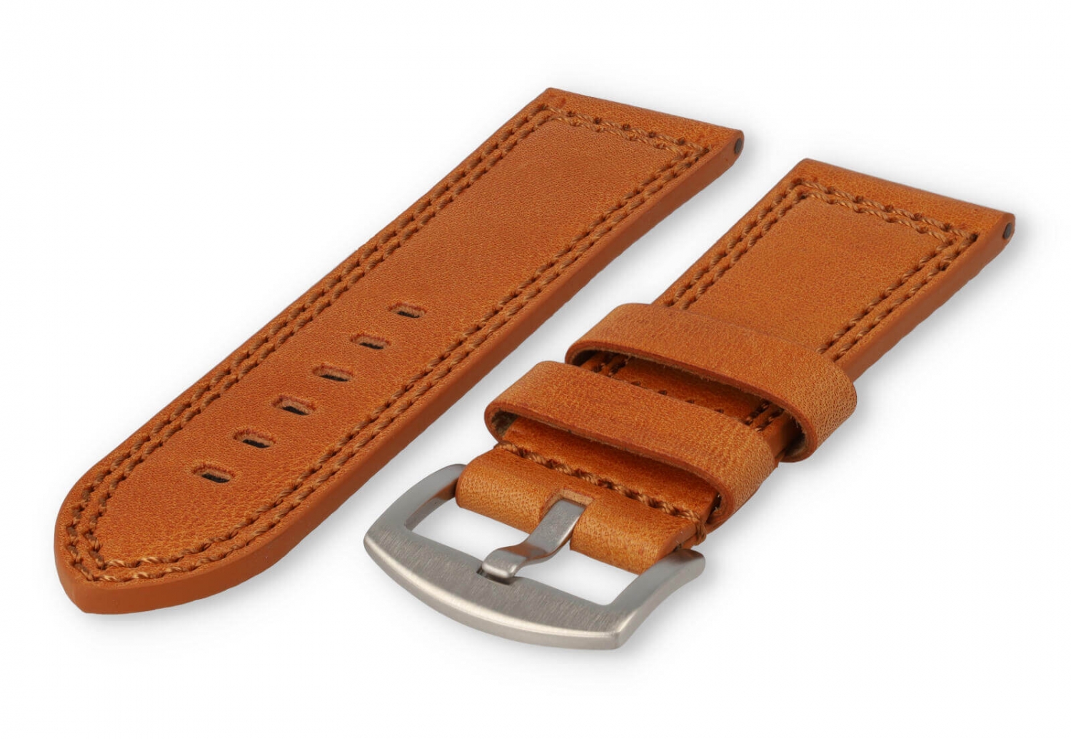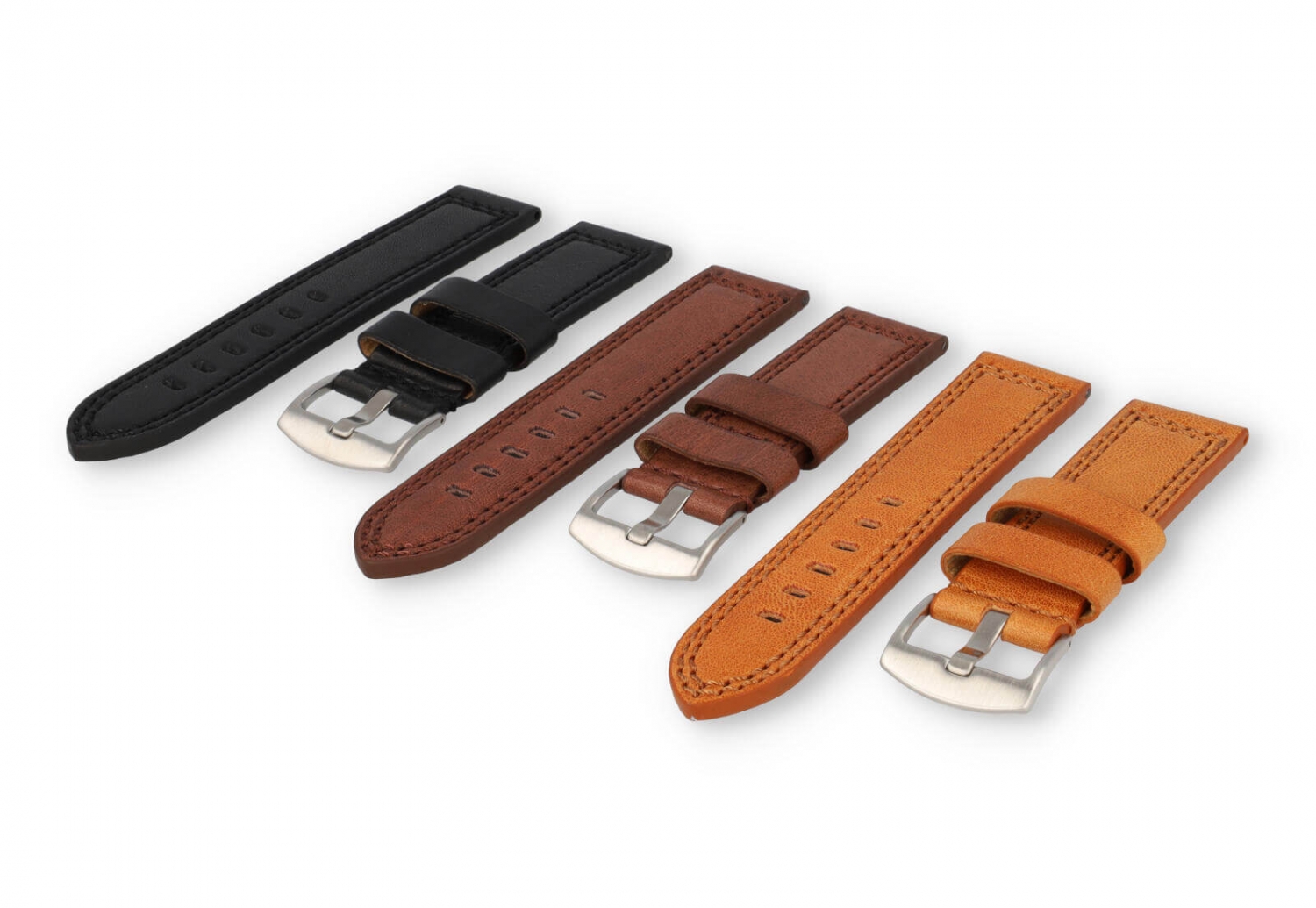 Deze serie horlogebanden is beschikbaar in 3 kleuren en 5 verschillende maten. De horlogebanden zijn gemaakt van echt kalfsleer en hebben rondom een dubbel stiksel. De roestvrij stalen gesp heeft een brede pin voor extra security tijdens het dragen.