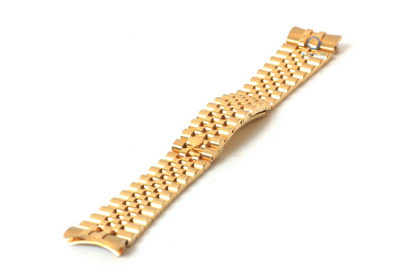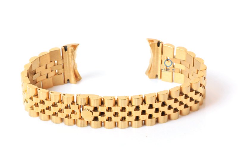 Rolex style horlogeband 17mm staal goud. Deze gouden edelstalen horlogeband heeft een ronde aanzet, zodat het bandje perfect aansluit op de horlogekast.