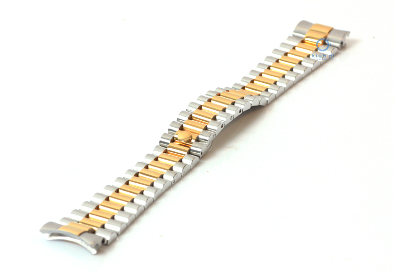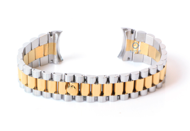 Rolex style horlogeband 20mm staal bicolor zilver/goud. Deze zilveren edelstalen horlogeband heeft een ronde aanzet, zodat het bandje perfect aansluit op de horlogekast.