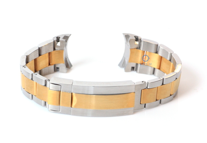 Rolex style horlogeband 21mm staal zilver / goud. Deze massieve, edelstalen horlogeband heeft een ronde aanzet waarmee hij perfect aansluit op de horlogekast.