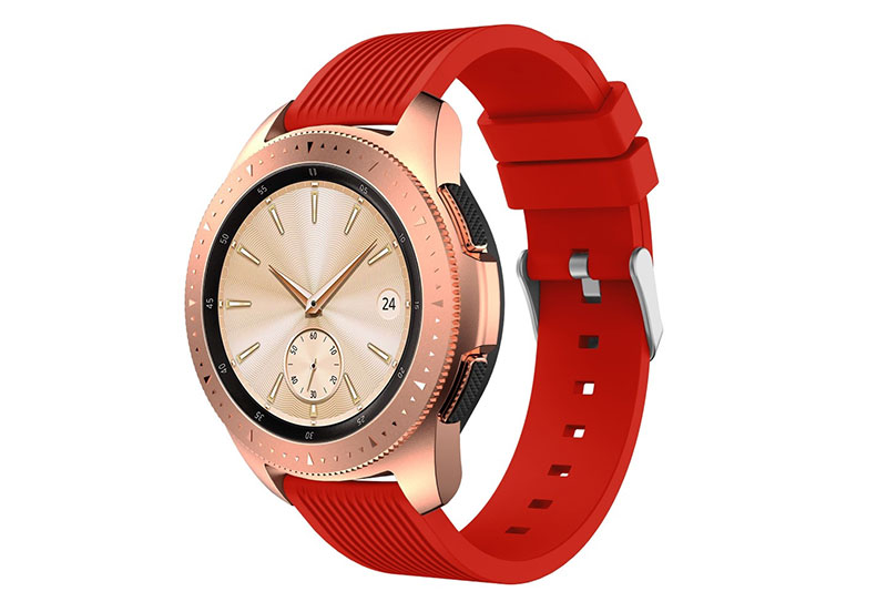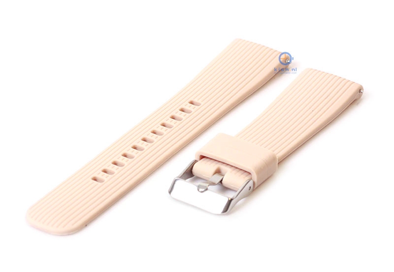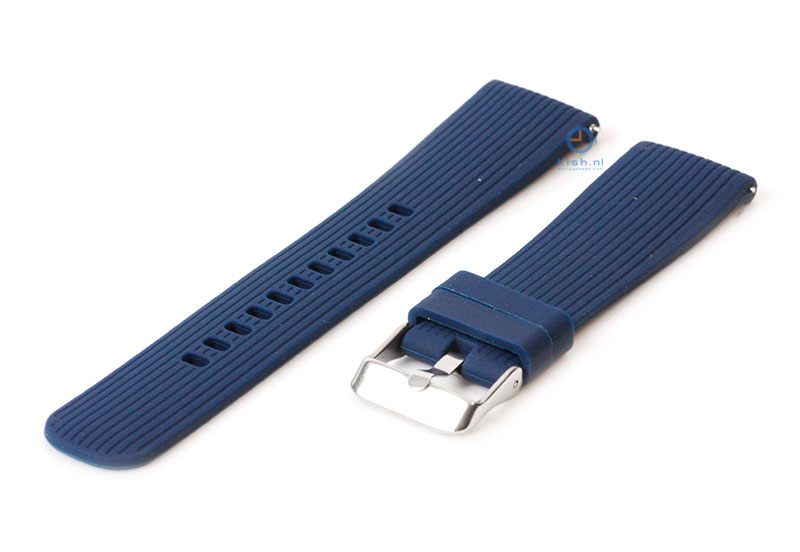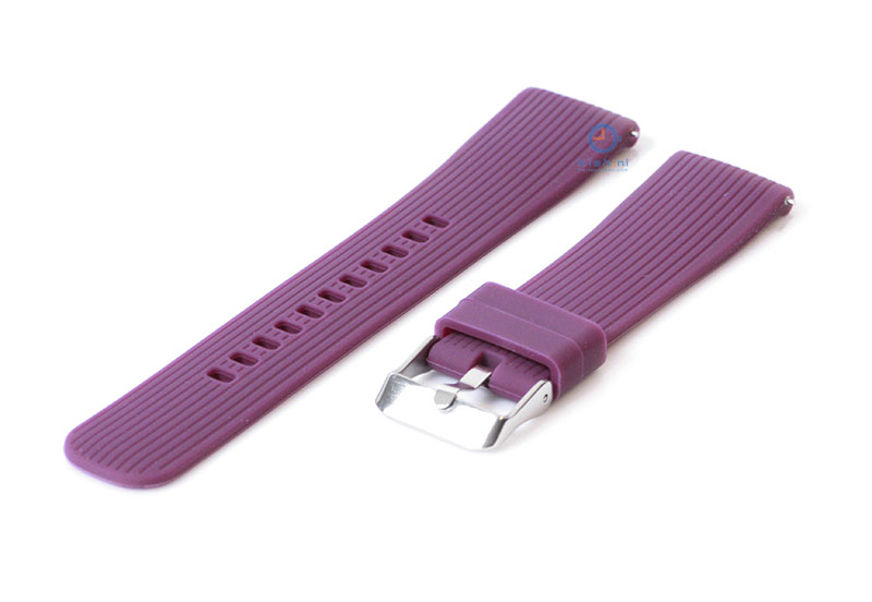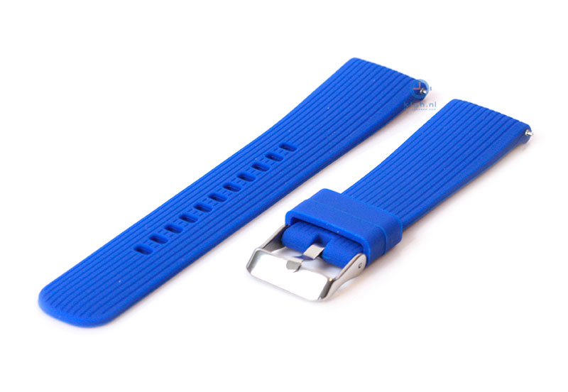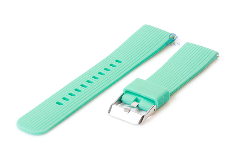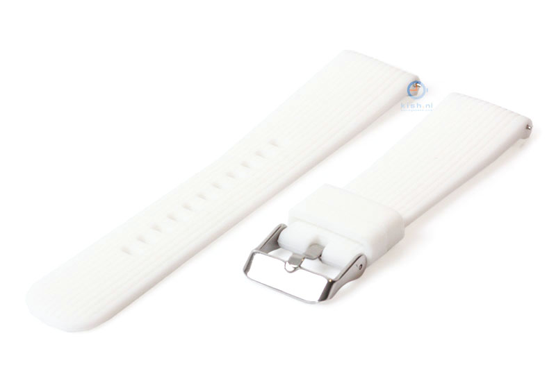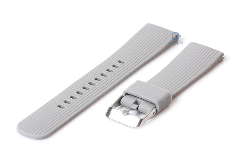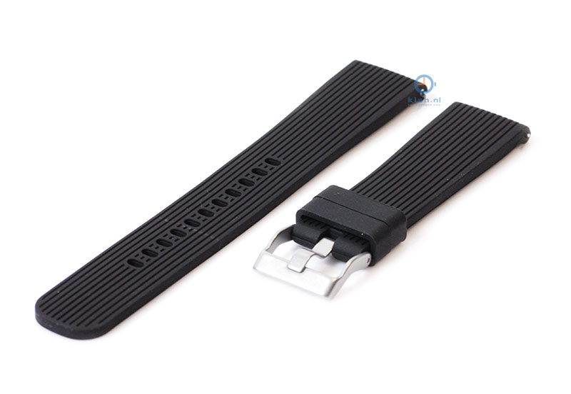 Samsung Galaxy 42mm. Het horlogebandje is gemaakt van flexibel siliconen, waardoor het horlogebandje goed aansluit om de pols en fijn draagt. De kwaliteit van het siliconen is uitstekend en de band word gesloten met een zilveren gespsluiting. Je monteert het horlogebandje binnen enkele seconden aan je horloge met het