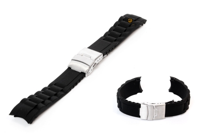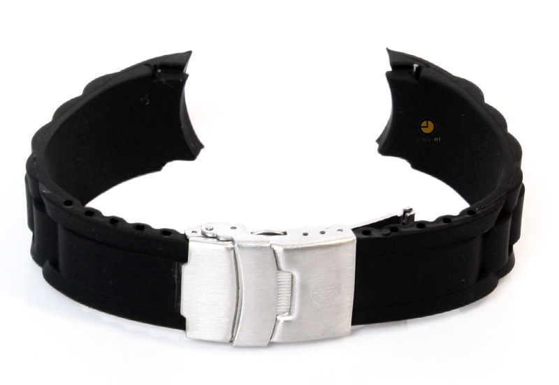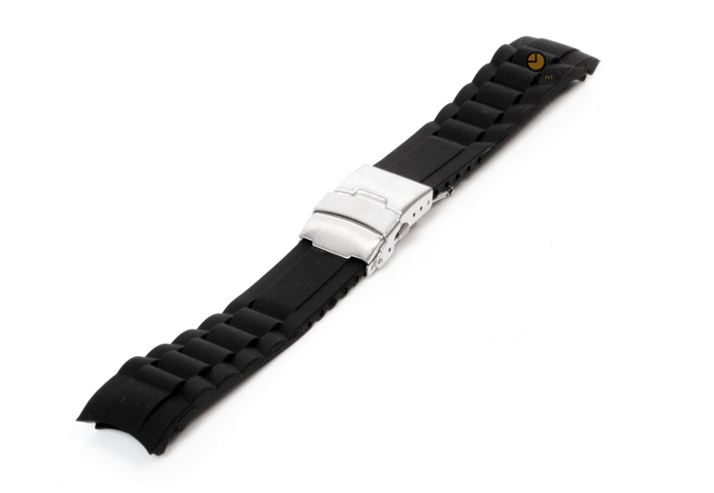 Deze zwarte siliconen horlogeband heeft een ronde aanzet, zodat het bandje perfect aansluit op de horlogekast. De band wordt geleverd inclusief roestvrij stalen vouwsluiting. Bestel gelijk een set springbars mee en de springbar removal tool voor het nog sneller vervangen van je horlogeband.