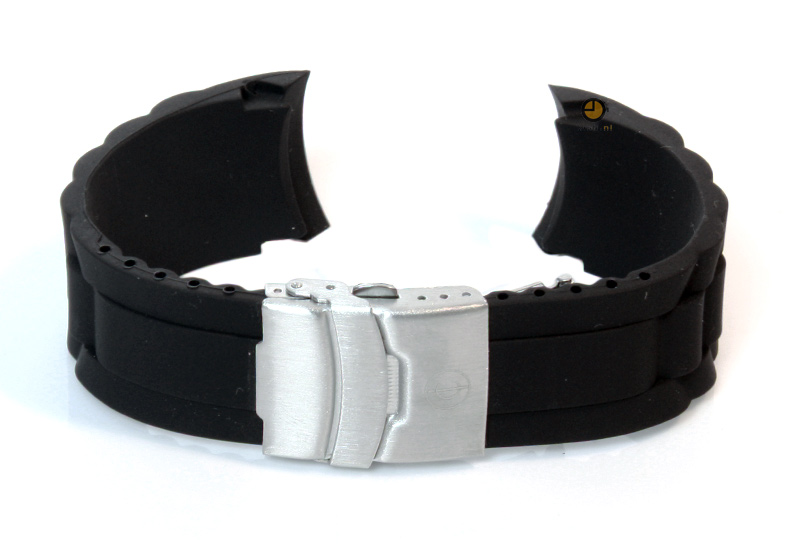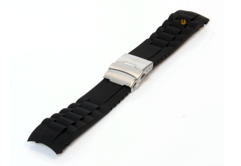 Deze zwarte siliconen horlogeband heeft een ronde aanzet, zodat het bandje perfect aansluit op de horlogekast. De band wordt geleverd inclusief roestvrij stalen vouwsluiting. Bestel gelijk een set springbars mee en de springbar removal tool voor het nog sneller vervangen van je horlogeband.