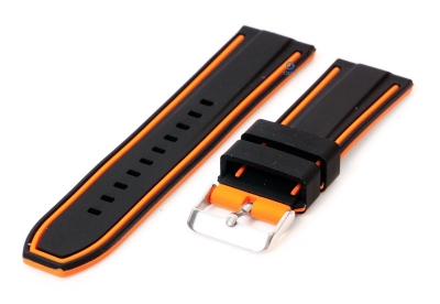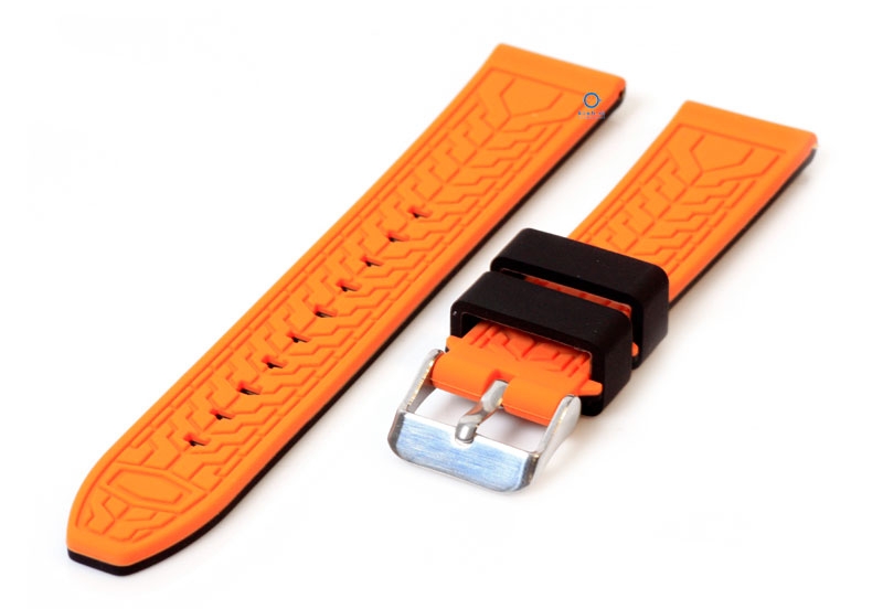 Maak van jouw horloge een blikvanger! Deze omkeerbare horlogeband heeft aan beide kanten een sportieve look. Het zwarte horlogebandje heeft twee oranje lijnen en aan de andere kant een oranje bandenmotief.