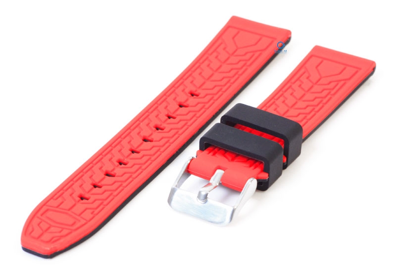 Maak van jouw horloge een blikvanger! Deze omkeerbare horlogeband heeft aan beide kanten een sportieve look. Het zwarte horlogebandje heeft twee rode lijnen en aan de andere kant een rood bandenmotief.