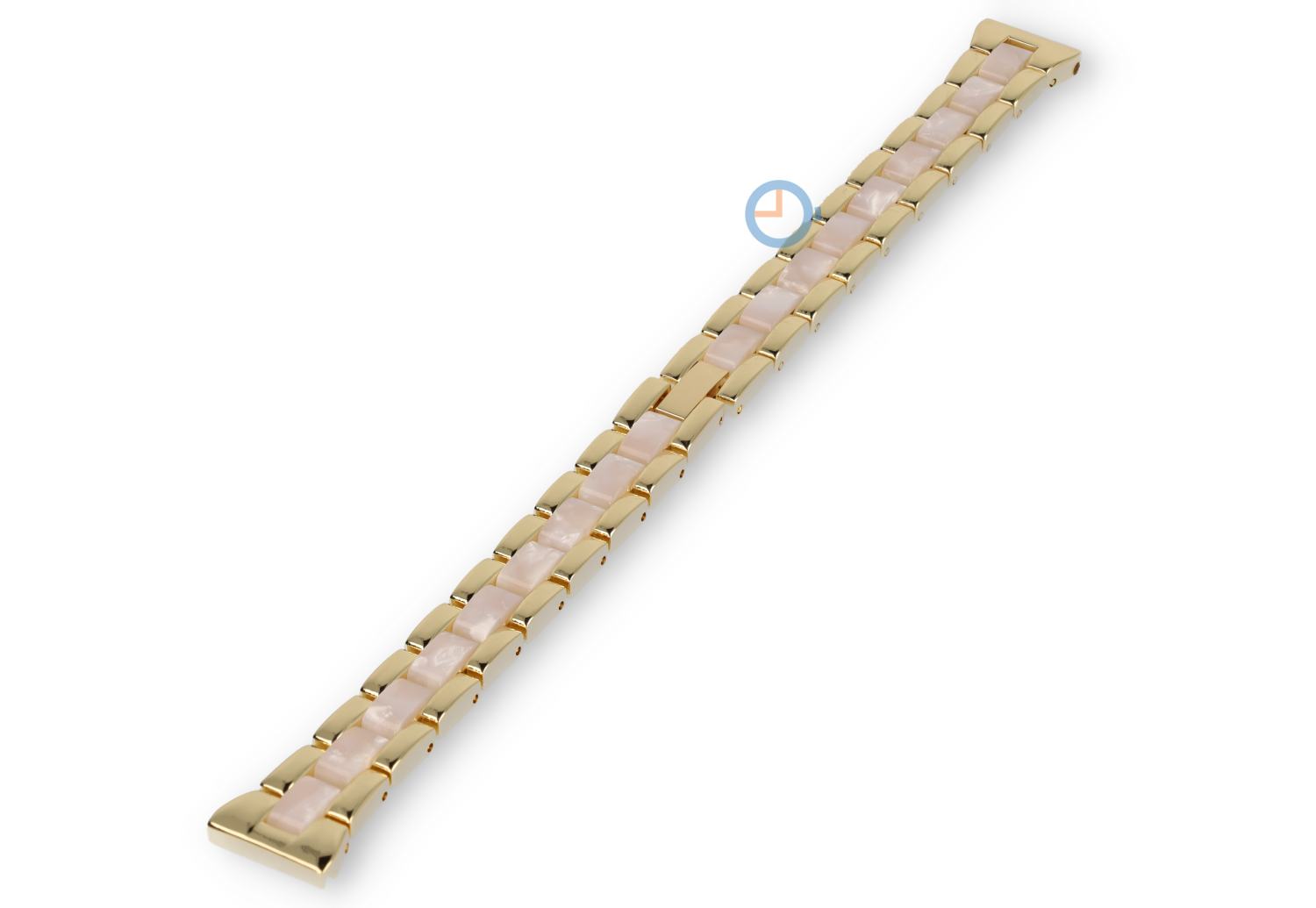 Artikel D005: universeel stalen horlogebandje in Michael Kors-style - 14mm - yellow gold/white - lengte: 170mm - De bandbreedte bij de rechte aanzet is 14mm en je kunt het bandje bevestigen met quick-switch pinnen (let op: alleen aan horloges met een rechte aanzet van 14mm). De lengte is maximaal 170mm en kun je inkorten met maarliefst 14 schakels. Deze band wordt gesluiten met een stevige armband sluiting die je makkelijk open en dicht klikt.