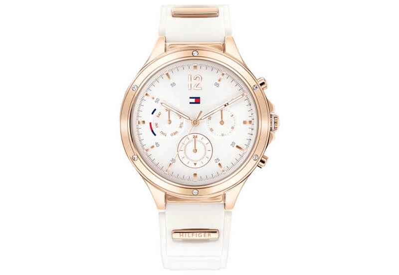 Originele Tommy Hilfiger Eve TH1782280 horlogeband. Een siliconen horlogeband staat er om bekend dat hij erg flexibel is en waterbestendig. Vanaf het eerste moment draagt dit materiaal direct fijn en sluit goed aan om de pols.