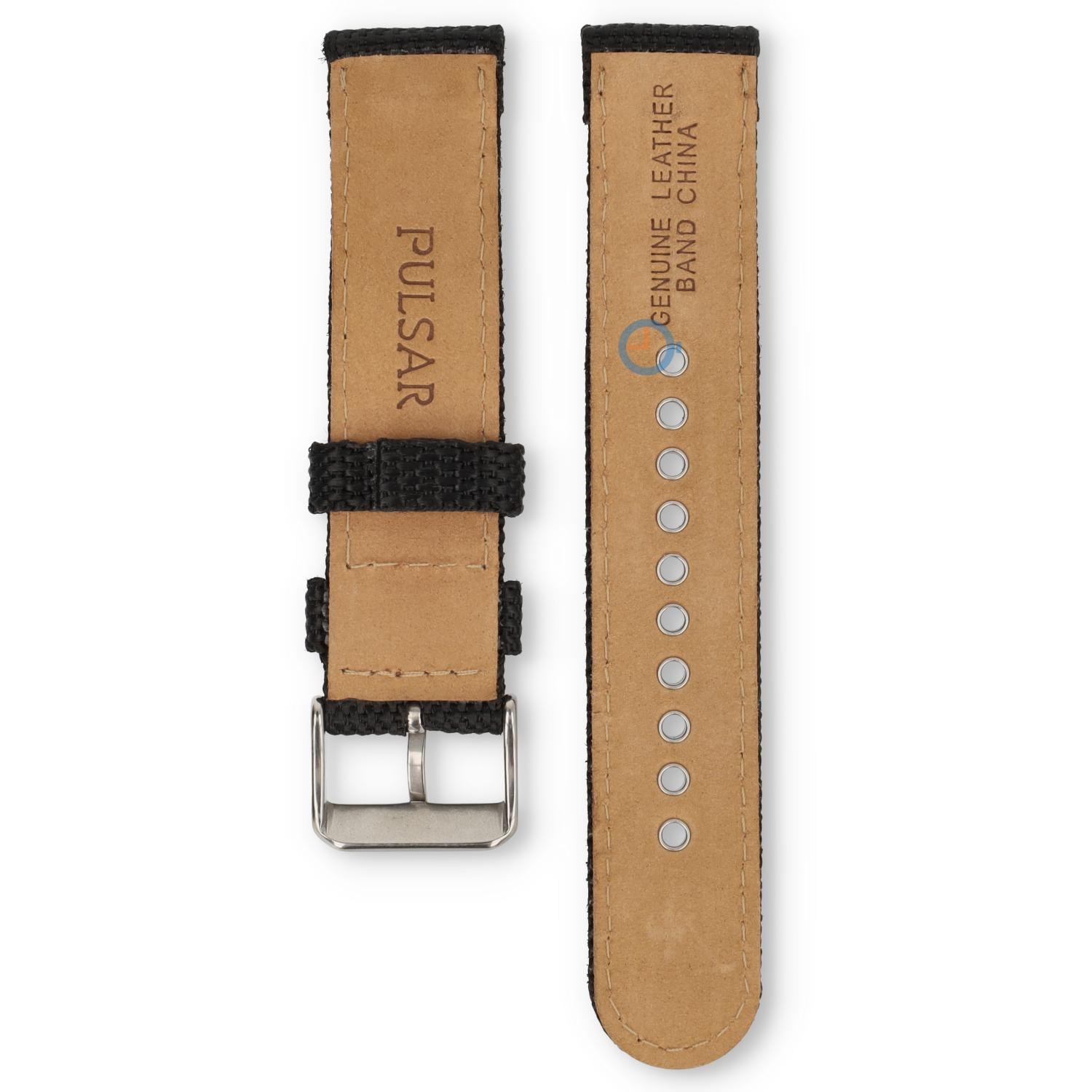 Universele 20mm leren horlogeband met textiel - Pulsar. Horlogeband van leer met zwart overtrokken textiel en met ijzer gestanste gaatjes voor een stoere, robuuste look..