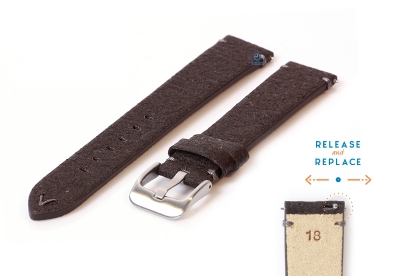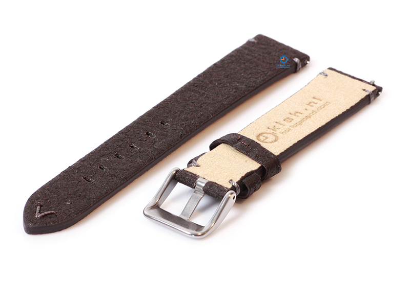 Vegan horlogeband 18mm donkerbruin. Deze veganistische horlogeband is gemaakt van ananasblad, een duurzaam alternatief voor leer. Het gebruik van ananasblad geeft deze handgemaakte horlogeband een unieke uitstraling. Dit horlogebandje behoort tot onze Premium-collectie. In deze collectie staan kwaliteit en duurzaamheid op nummer 1, waardoor de levensduur extra lang is.