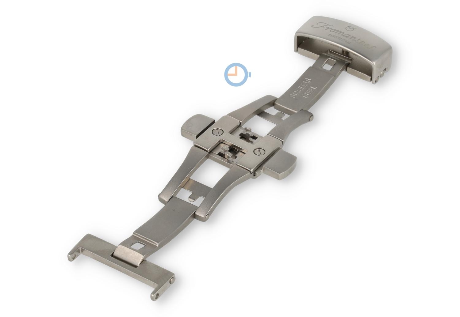 Luxe vouwsluiting van het merk Fromanteel - upgrade je horlogeband met deze originele vlindersluiting met drukkers. Kies zelf of je een mat stalen of glanzend stalen sluiting wenst.