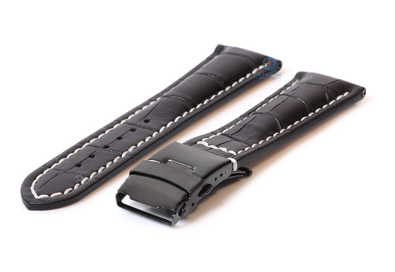 Stevige leren horlogeband van het merk Gisoni. Deze 22mm zwarte horlogeband met crocoprint heeft een luxe wit stiksel dat met de hand is gezet. De horlogeband is gemaakt van echt kwaliteitleder en dat zie je zeker terug. Het horlogebandje wordt gesloten met een stevige zilverkleurige vouwsluiting.