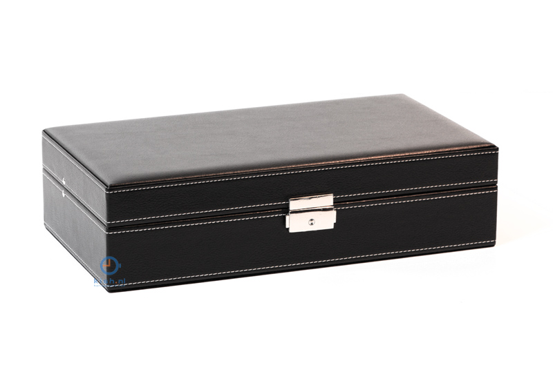 Deze zwart lederen horlogebox biedt plaats aan 10 grote horloges horloges. Dankzij de ruimte tussen de kussens en de deksel maken de horloges geen contact met de horlogebox en worden beschadigingen voorkomen. De lederen horlogekist is afgewerkt met wit stiksel dit geeft de horlogekist een chique uiterlijk. De horlogebox is voorzien van een slot, bij de horlogekist ontvangt u een sleutel.