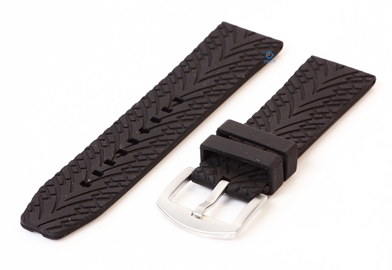 Robuuste, zwart rubberen horlogeband in maat 24mm. Leuk detail: de onderkant van dit horlogebandje heeft een autobandenmotief. Je kunt het horlogebandje alle 2 kanten dragen. Je hoeft dan alleen het gespje om te draaien.